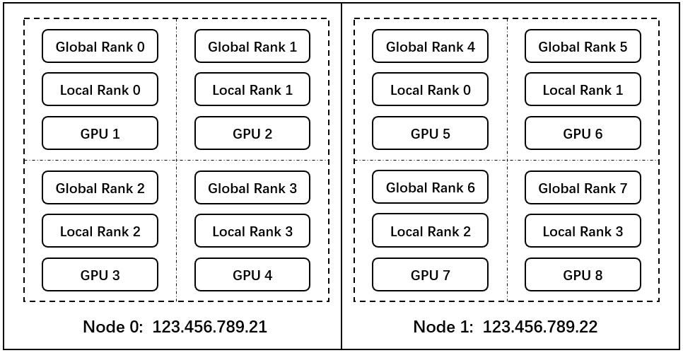 rank: It is used to represent the number / sequence number of processes (in some structural diagrams, rank refers to soft nodes, and rank can be regarded as a computing unit). Each process corresponds to a rank process, and the whole distribution is completed by many ranks.node: The physical node can be a machine or a container, and there can be multiple GPUs inside the node.local rank: It refers to the relative sequence number of the process on a node and is independent between nodes.world size: The number of ranks in the global (the whole distributed task).